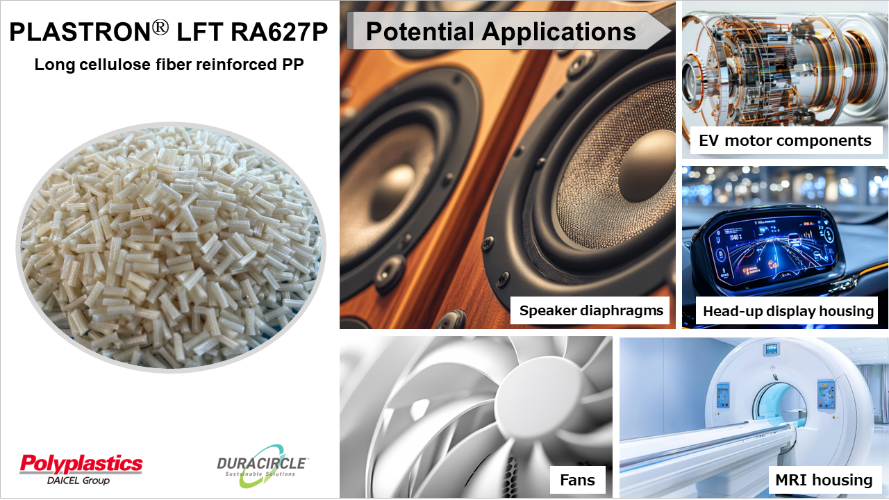 本公司开始销售使用了低PCF(产品碳足迹)的再生纤维素纤维制造的PP树脂PLASTRON LFT RA627P 。由于该材料具有高损耗系数,基于该特点,我们认为除了扬声器振膜等音响设备零部件与乐器零部件以外,本产品还适用于具有旋转体、振动部位或者暴露于振动中的设备的外壳和构件(例如电动汽车电机周边零部件、平视显示器外壳、各种风扇、MRI设备外壳)等,并将致力为广泛领域的产品提供材料方案。此外,本公司还在开发一种使用再生PP树脂的新品级,以期进一步减少PCF(产品碳足迹)。今后,为了进一步满足市场需求,我们将扩大PLASTRON LFT产品组合,与客户携手并肩,为加快实现循环型社会做出贡献。