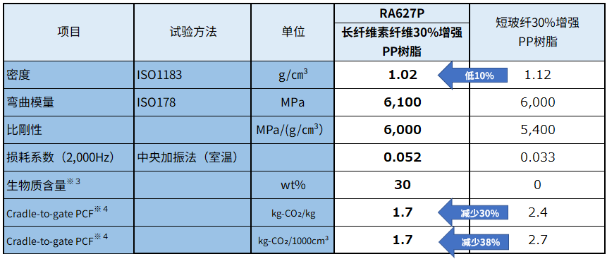 PLASTRON RA627P是一种使用了PCF(产品碳足迹)非常小的再生纤维素纤维来制造的长纤维纤维素增强PP树脂,其PCF(产品碳足迹)※4比短玻纤30%增​​强的PP树脂低约30%(以单位材料体积比较则低约38%)。